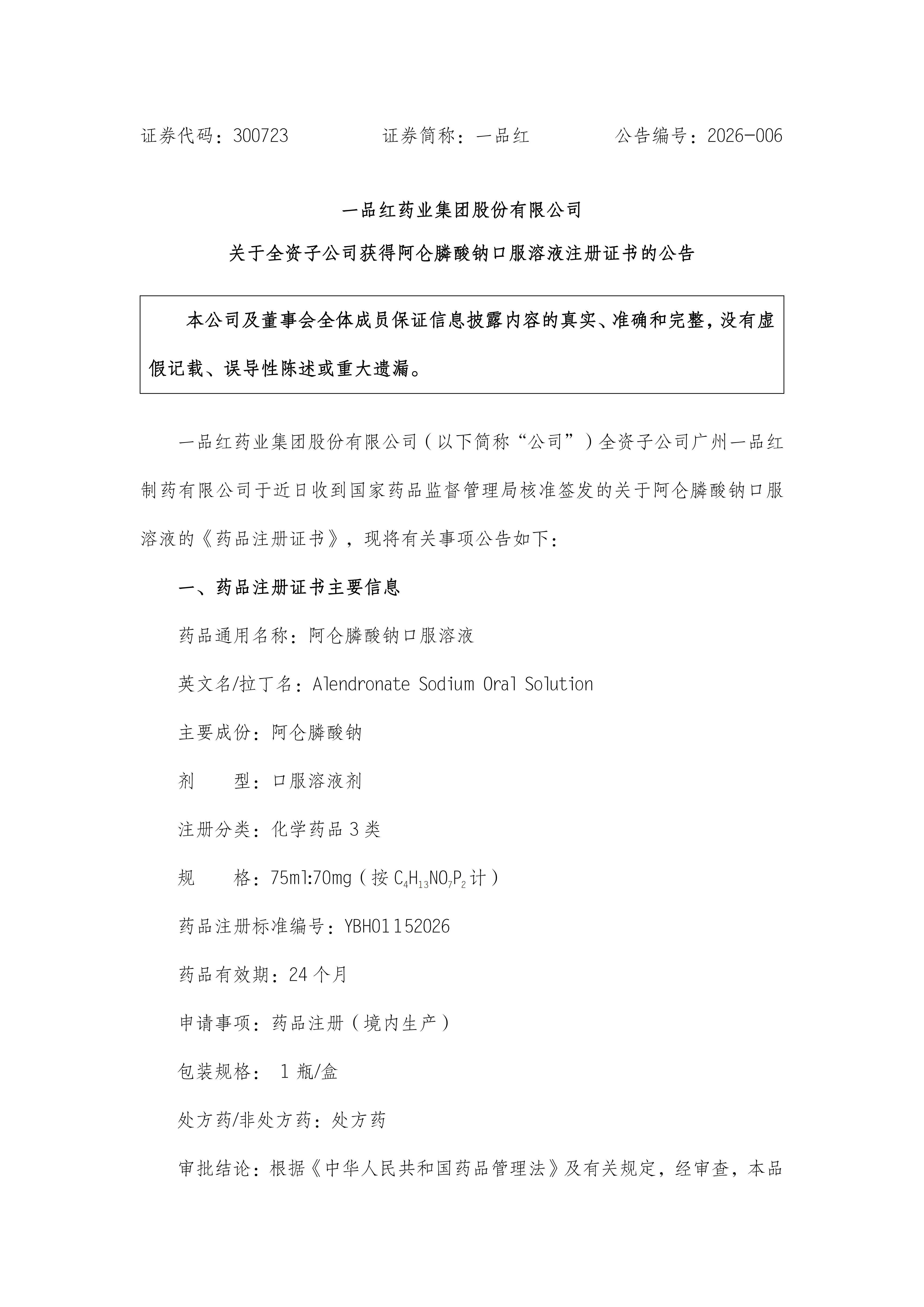 根据《米兰·(milan)药业集团股份有限公司关于全资子公司获得阿仑膦酸钠口服溶液注册证书的公告》(公告编号:2026-006),现予以公告。